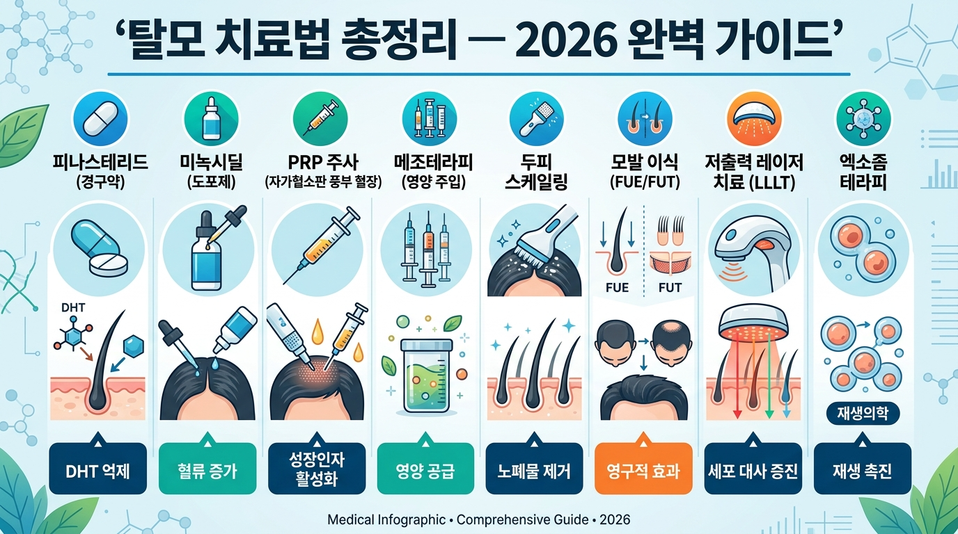 이 글에서는 2026년 기준으로 활용 가능한 7가지 주요 탈모 치료법을 근거 수준·효과·비용·부작용·회복기간·보험 적용 여부까지 체계적으로 비교합니다. 탈모 검사 비용·건강보험 가이드(Spoke ④)를 먼저 읽고 정확한 진단을 받으신 후, 이 글의 비교표를 참고하여 자신에게 맞는 치료 조합을 선택하시길 권장합니다.
