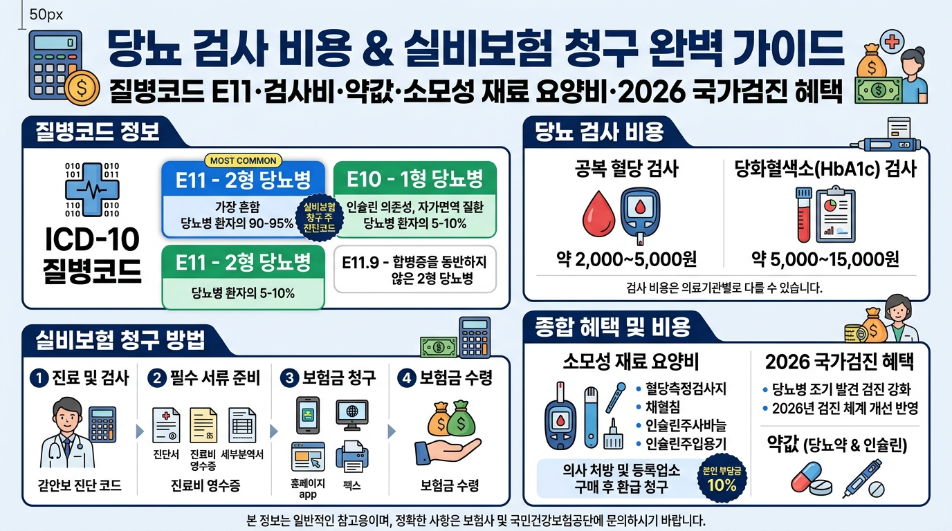 💰 당뇨 검사 비용 & 실비보험 청구 완벽 가이드 — 질병코드 E11·검사비·약값·소모성 재료 요양비·2026 국가검진 혜택까지 총정리