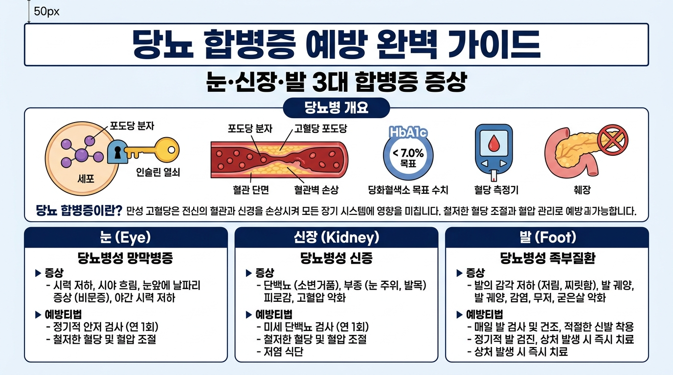 🛡️ 당뇨 합병증 예방 완벽 가이드 — 눈·신장·발 3대 합병증 증상·정기검진·자가점검·치료비까지 총정리