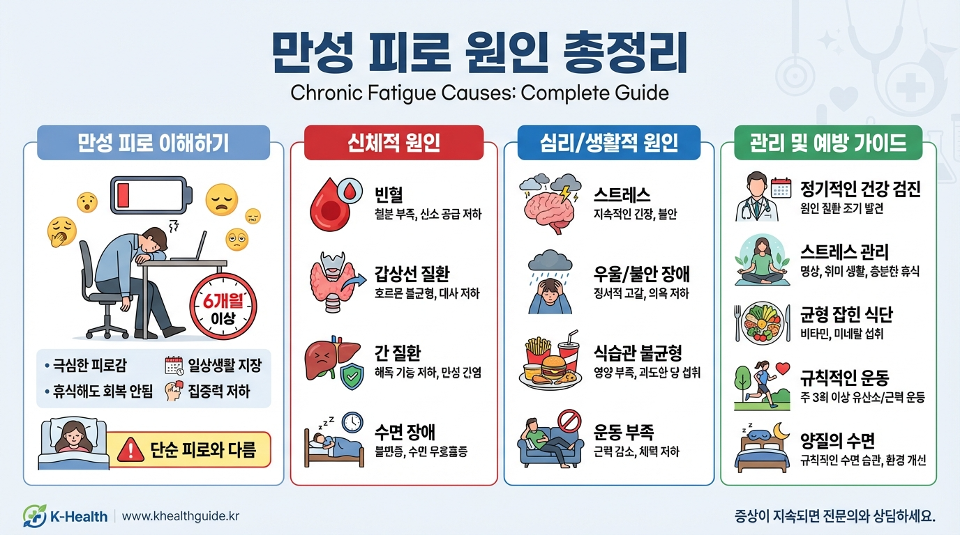 ※ 본 글은 질병관리청·분당서울대학교병원·서울아산병원 등 공인 의학 자료를 바탕으로 일반적인 건강 정보를 제공하며, 의학적 진단·치료를 대체하지 않습니다. 만성 피로 증상이 지속되면 반드시 전문의와 상담하시기 바랍니다.