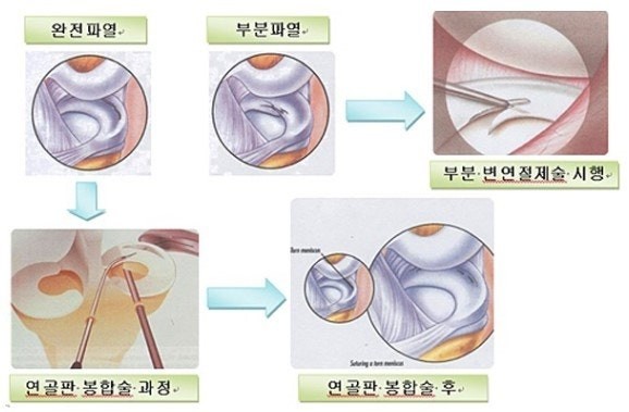 | 반월상연골 봉합술 | 찢어진 부위를 실로 꿰매 자연치유 유도 – 회복 시간은 길지만 기능 보존에 유리 |