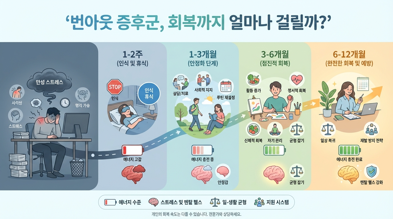 번아웃 증후군, 회복까지 얼마나 걸릴까? — 단계별 회복 기간·자가진단·우울증 구분법·극복 방법 완벽 가이드 (2026)