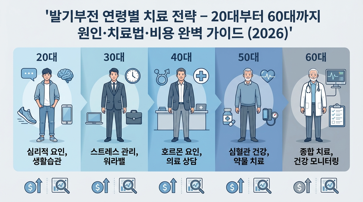 발기부전(ED)은 나이에 따라 원인과 접근 방식이 완전히 달라지는 질환입니다. 건강보험심사평가원(2025)에 따르면 연령별 유병률은 20대 약 15%, 30대 30%, 40대 40%, 50대 54%, 60대 70%로 증가합니다. 하지만 핵심은 "몇 살이든 적절한 치료로 회복이 가능하다"는 것입니다.