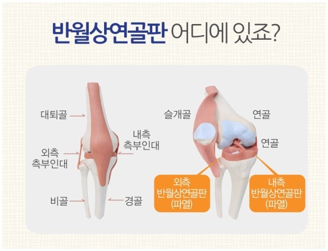 | 흔한 손상 원인 | 축구·농구 중 급격한 방향 전환, 쪼그려 앉기 | 원판형 연골(선천) 이상, 고강도 점프 |