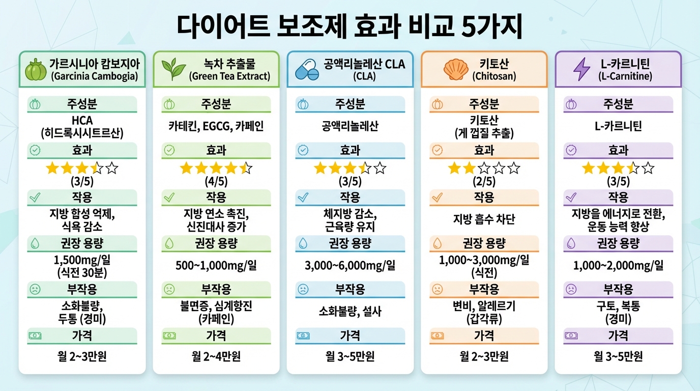 💊 다이어트 보조제, 정말 효과 있을까? 가르시니아, 녹차추출물, CLA 등 인기 보조제 5가지를 과학적 근거 기반으로 비교 분석했습니다. 나에게 맞는 보조제를 선택하세요!