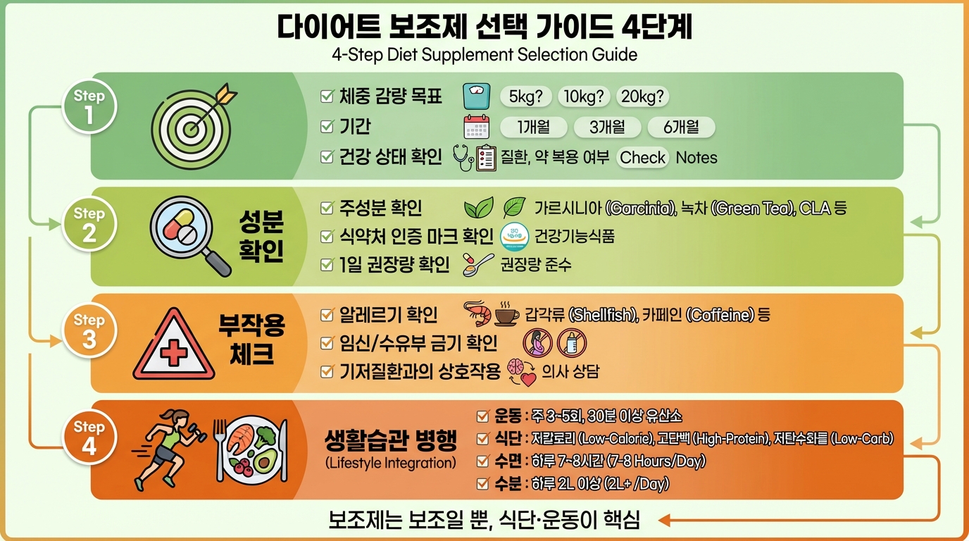 ⚠️ 중요: 다이어트 보조제는 "보조"일 뿐입니다. 식이요법과 운동 없이 보조제만으로 살을 빼기는 어렵습니다. 보조제 복용 시 평균 체중 감량은 월 1~2kg 수준입니다.