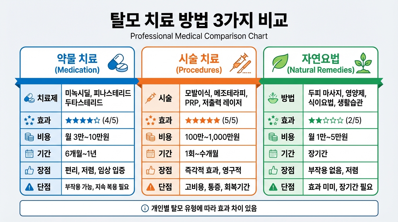 탈모 치료는 크게 약물 치료, 시술 치료, 자연요법 3가지로 나뉩니다. 각 방법의 특징을 한눈에 비교해 보세요!